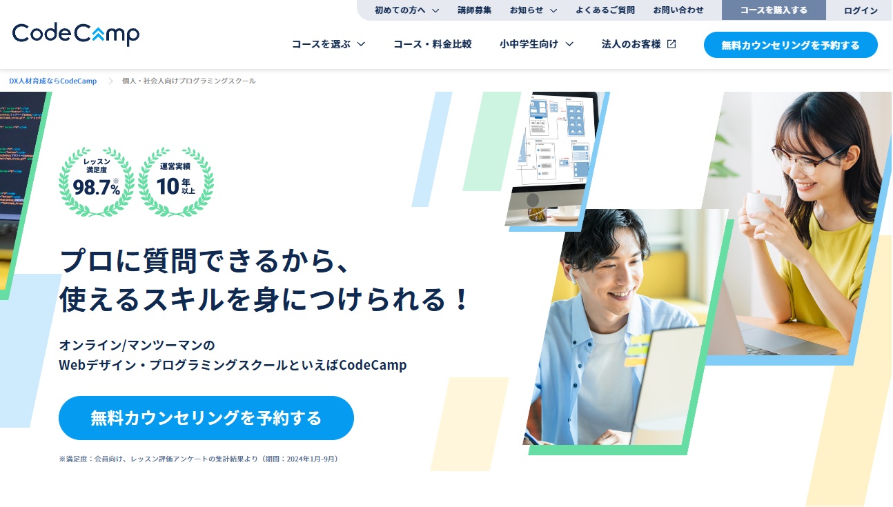 CodeCampは、未経験からでも実践的なスキルを身につけられるオンラインプログラミングスクールです。現役エンジニアによるマンツーマン指導を特徴とし、自分の生活スタイルに合わせて学習を進められる点が高く評価されています。多様なコースが用意され、Web制作やアプリ開発など目的に応じた学習が可能です。