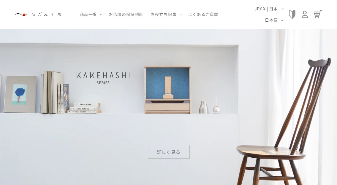 「なごみ工房」は、京都に1830年創業の老舗仏壇・仏具店が運営する仏具・仏壇の通販サイトです。伝統を大切にしながら現代の住まいに合うモダンでおしゃれなデザインの仏壇・仏具、盆提灯、線香、お位牌など幅広い商品を取り扱っています。コンパクトでインテリア性の高いデザインが人気で、ライフスタイルに合わせた仏具選びができます。