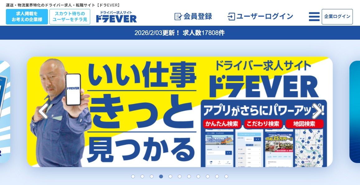 ドラエバーは、トラック・配送・軽貨物などドライバー職に特化した求人情報を掲載する専門求人サイトです。未経験から経験者まで幅広い求人を取り扱い、勤務地や雇用形態、車種別など細かな条件で仕事を探せるのが特徴です。ドライバー業界に詳しい視点で求人が整理されており、効率よく自分に合った仕事を見つけやすいサービスとして利用されています。