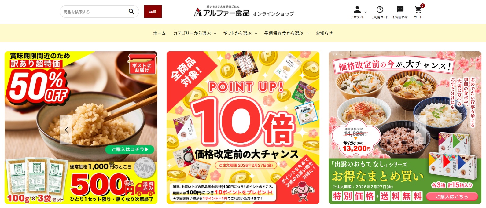 アルファ―食品は、長期保存が可能な備蓄食・非常食を中心に展開する食品メーカーです。独自のアルファ化技術を活かしたごはんシリーズは、お湯や水を注ぐだけで簡単に調理でき、災害時でも手軽に温かい食事をとることができます。家庭用はもちろん、自治体や企業の防災備蓄としても幅広く採用されており、安心とおいしさを両立した商品づくりが特長です。